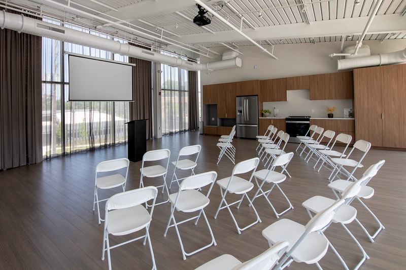 Event Center: Wi-Fi, rollaway TV, amp, projector and 2 microphones. Let us know your setup needs and we’ll help get everything in place—especially helpful if you’re using the space as a corporate conference room, coworking-style meeting room, or hotel conference room rental alternative.